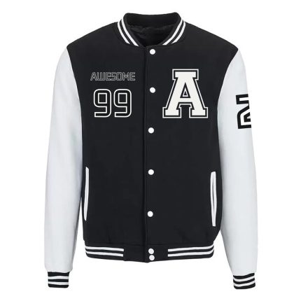 Make a bold statement with this navy blue varsity jacket, featuring the iconic “Awesome 99” printed design. Crafted for comfort